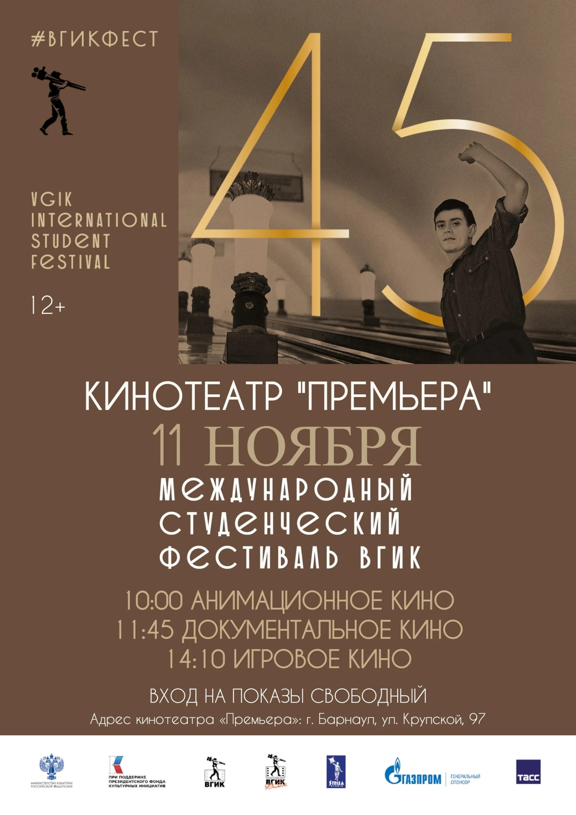 11 ноября в кинотеатре «Премьера» состоится показ лучших фильмов 45-го Международного студенческого фестиваля ВГИК. Барнаульцам представят работы студентов из российских и зарубежных киношкол.
