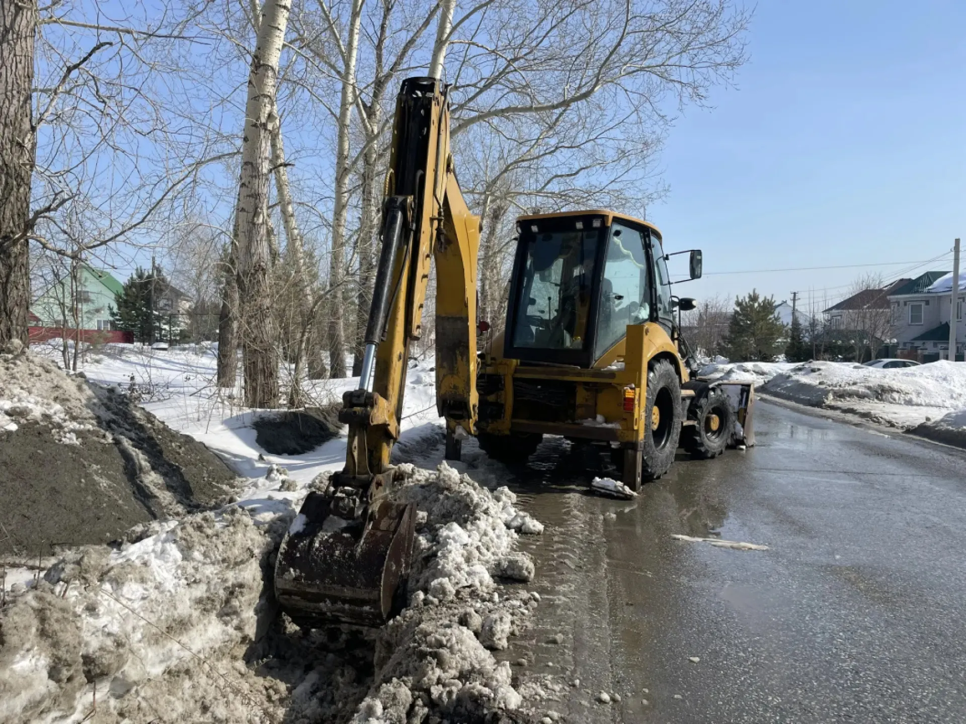 На пересечении Павловского тракта с улицами Христенко и 65 лет Победы ведется отвод талых вод, чтобы дорога оставалась проезжей даже при активном снеготаянии.