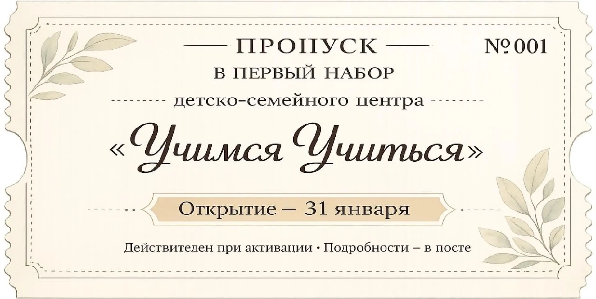 Официальное открытие центра состоится 31 января. В этот день пройдёт презентация основной образовательной программы центра, детский мастер-класс от партнёра, будет работать аниматор, запланирован лёгкий фуршет и розыгрыш абонемента на месяц обучения по одной из программ.
