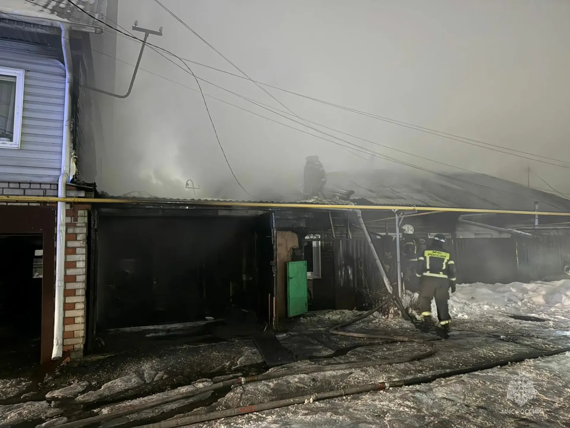 На момент прибытия пожарных открытым огнём горели одноэтажный дом, а также частично крыша двухэтажного соседнего дома.
