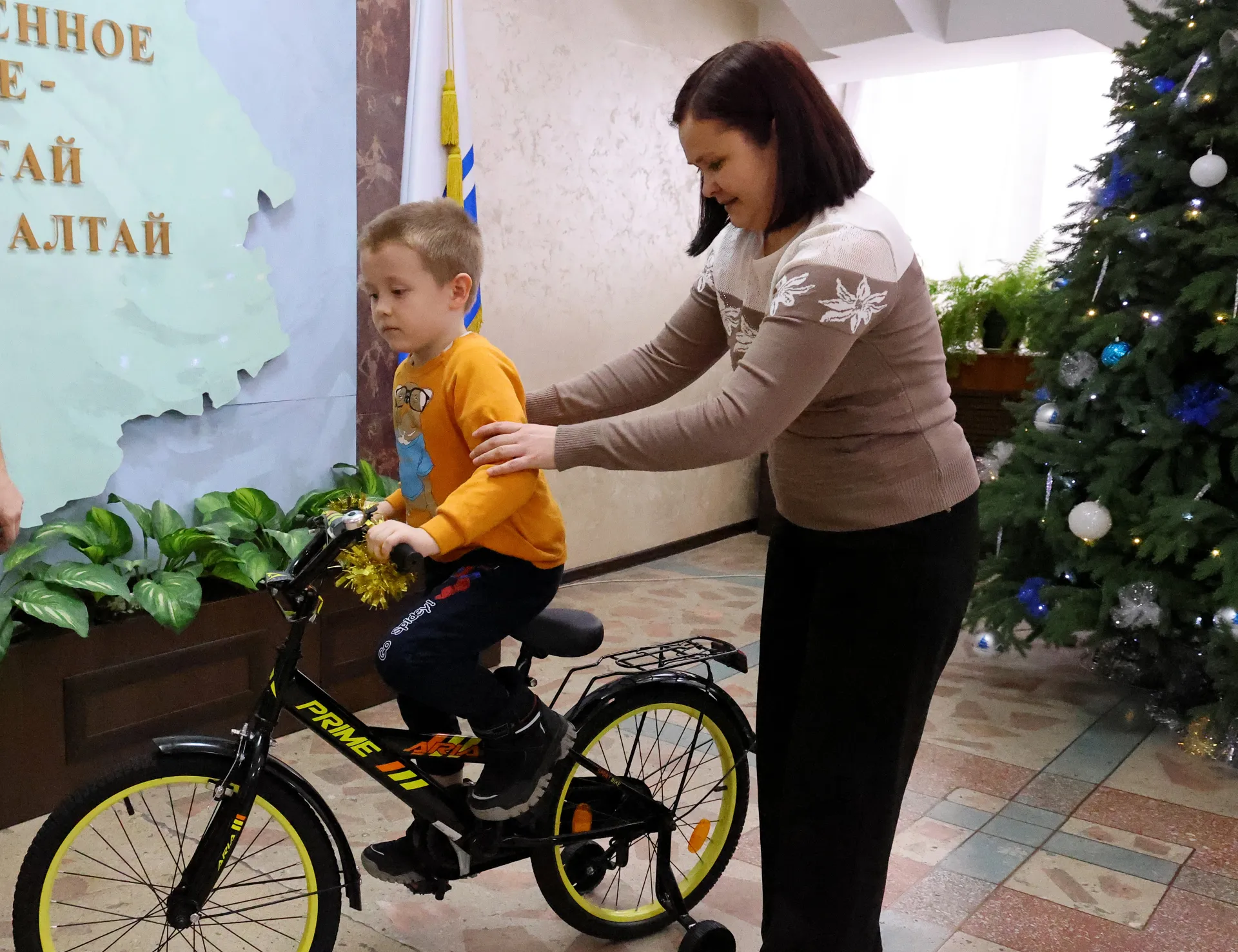 Семилетний Дима живёт в селе Кызыл-Озек Майминского района Республики Алтай. Он любит заниматься спортом – особенно ему нравится плавать и кататься на роликах. В подарок мальчик мечтал получить велосипед. Анатолий Серышев исполнил новогоднее желание Димы: от имени полпреда мальчику вручили удобный двухколесный велосипед, на котором он сразу попробовал прокатиться.