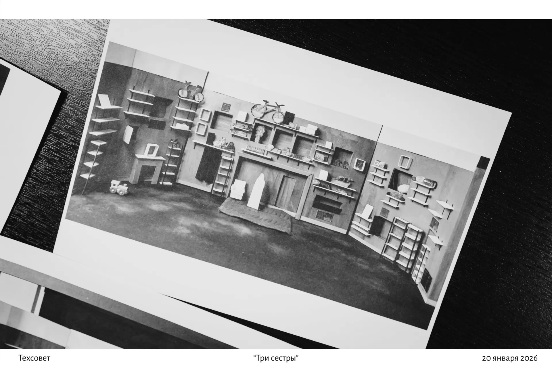 «Старенькая квартира. Стены цвета плесени. Это словно музей. Там есть всё: от раритетов времён Петра I до изделий СССР. Так выглядит пространство, из которого Ольга, Маша и Ирина, героини пьесы А. П. Чехова „Три сестры“, будут стремиться уехать в Москву», – пишут в группе театра во «ВКонтакте».