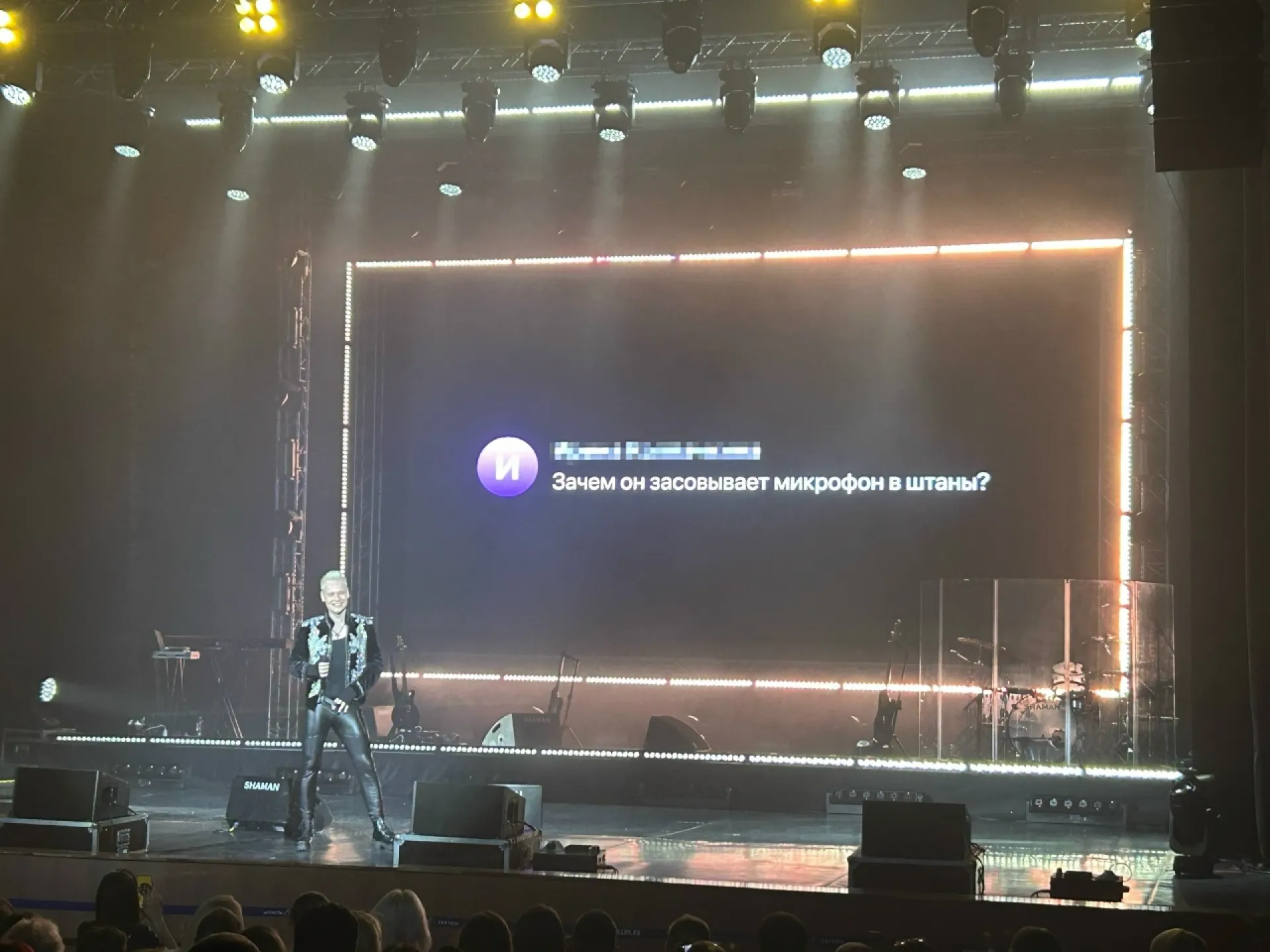 «Темы ниже пояса не дают покоя. А куда мне его еще деть? Я пробовал убрать его под мышку, но тогда я не могу аплодировать вам с той широтой привычной мне амплитуды. Пробовал между коленей, но это выглядит нелепо. Стойка для микрофона — от нее далеко не отойдешь. Поэтому остается единственный верный вариант», — пояснил с улыбкой SHAMAN.