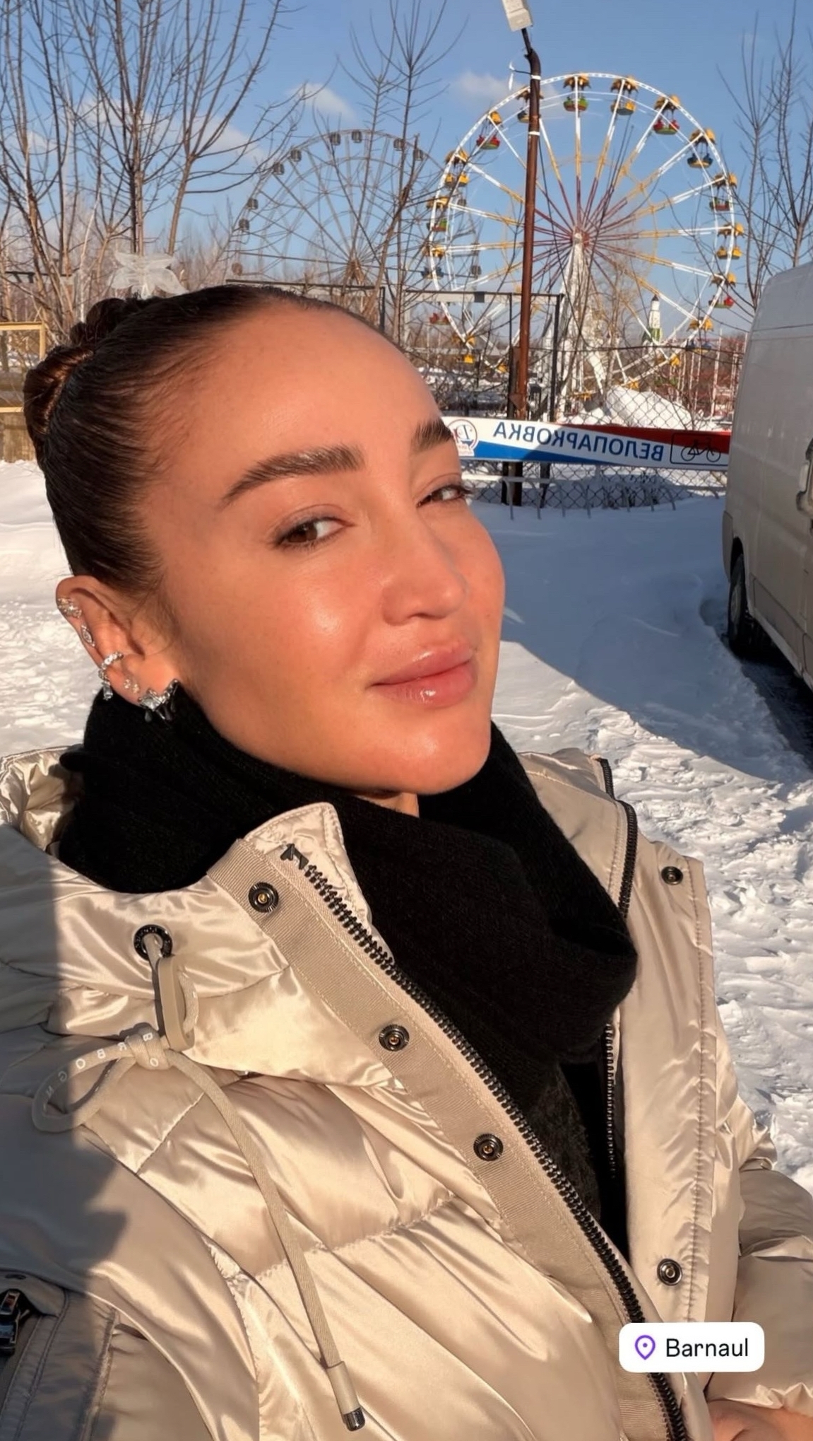 Прилетев в краевую столицу, артистка отметила, что здесь очень холодно. Позже она поделилась, что купила длинный теплый пуховик для тура, который позволил сделать прогулку по городу комфортной.