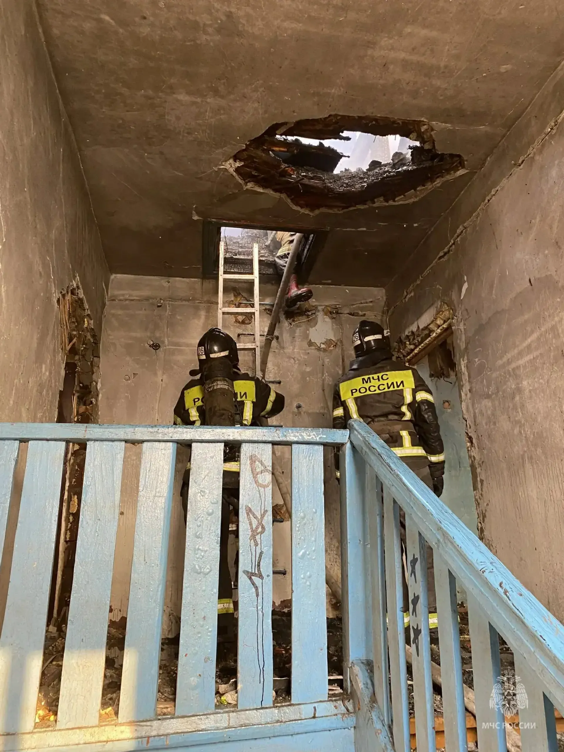 Площадь пожара составила около 300 кв. м. Огонь полностью уничтожил крышу, повредил потолочные перекрытия, лестницу и стены одного подъезда. Предварительная причина происшествия — неосторожное обращение с огнем.