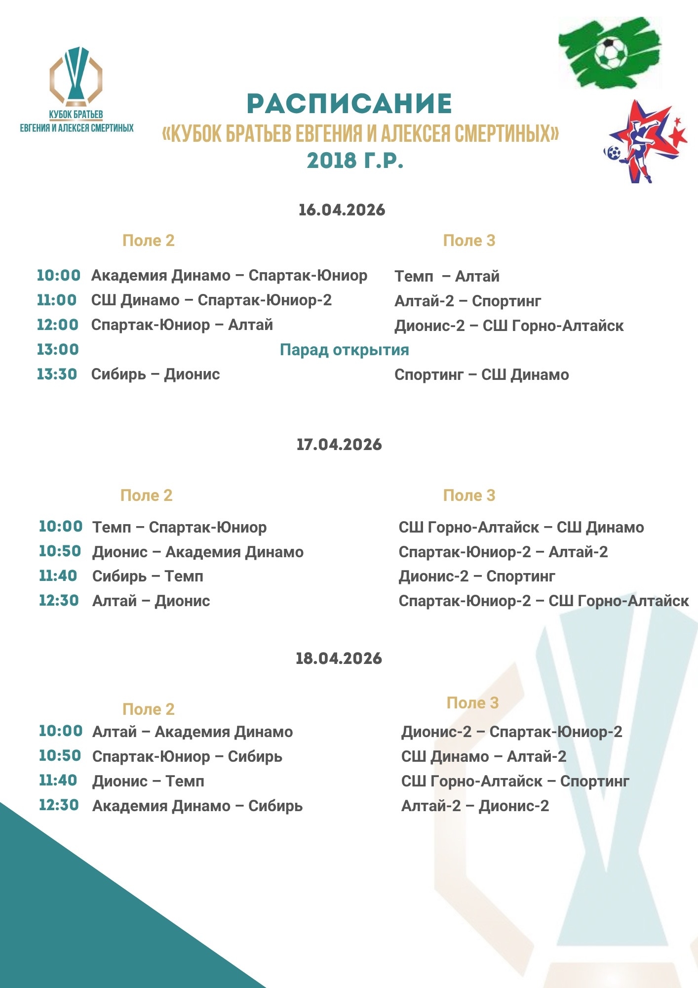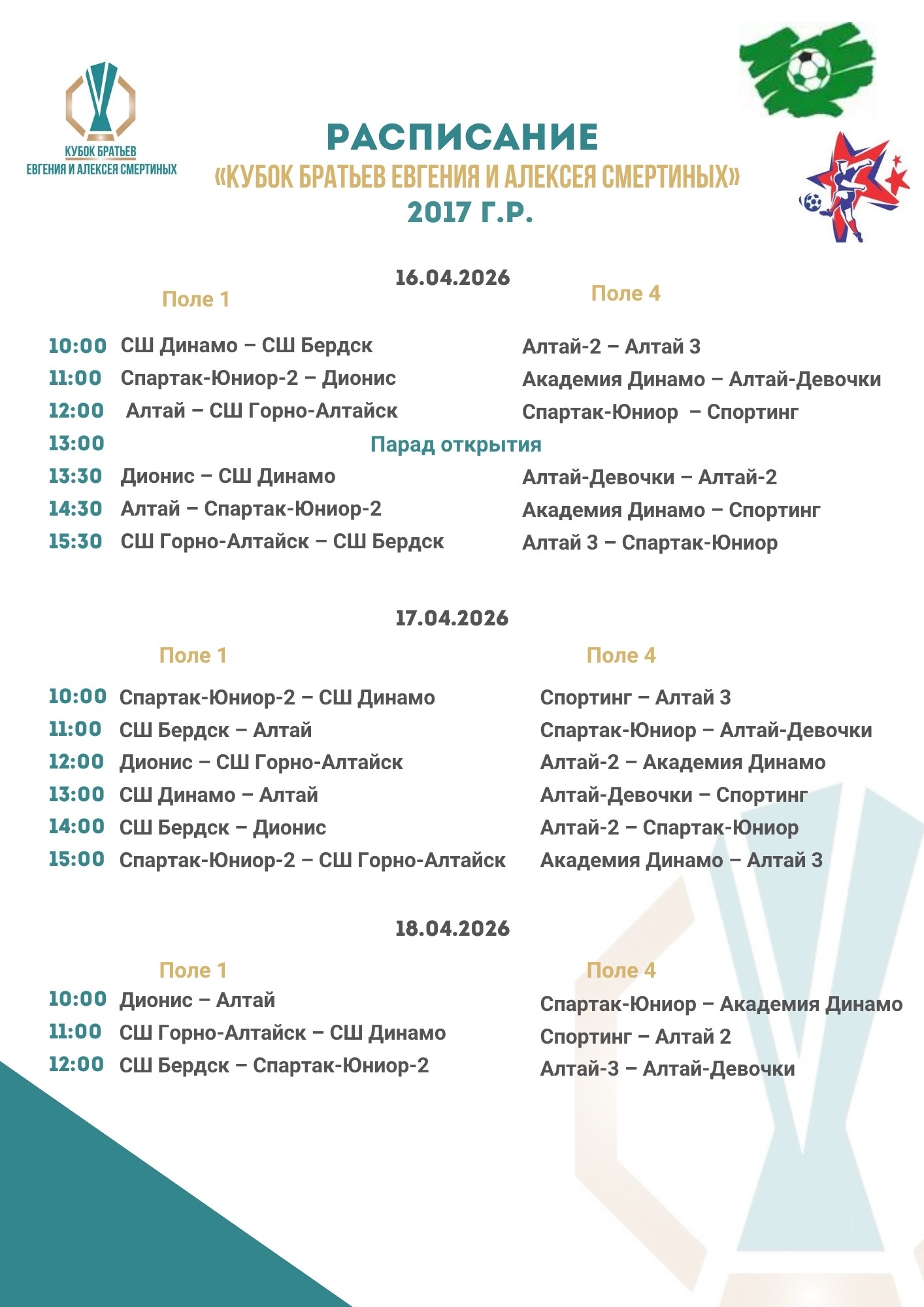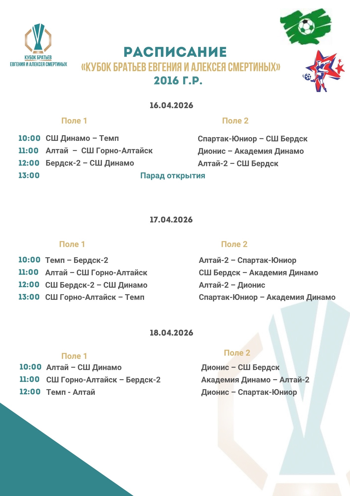 Участниками турнира станут команды местных футбольных школ «Динамо», СШОР А. Смертина, «Темп», «Дионис», а также гости из Бердска, Новокузнецка и Горно-Алтайска.